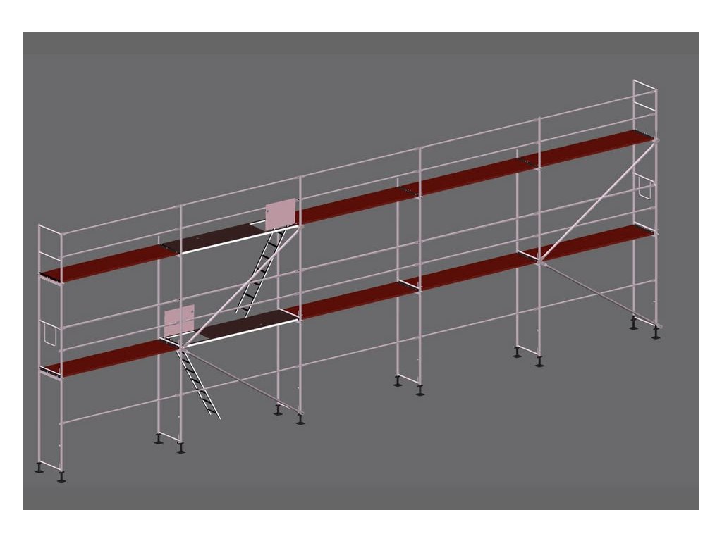 Kompletní sestava rámového lešení značky Mj UNI 70 / Plettac o rozměrech 15 x 6.4m 100m2 pracovní plochy (5 polí) s hmotností 854kg