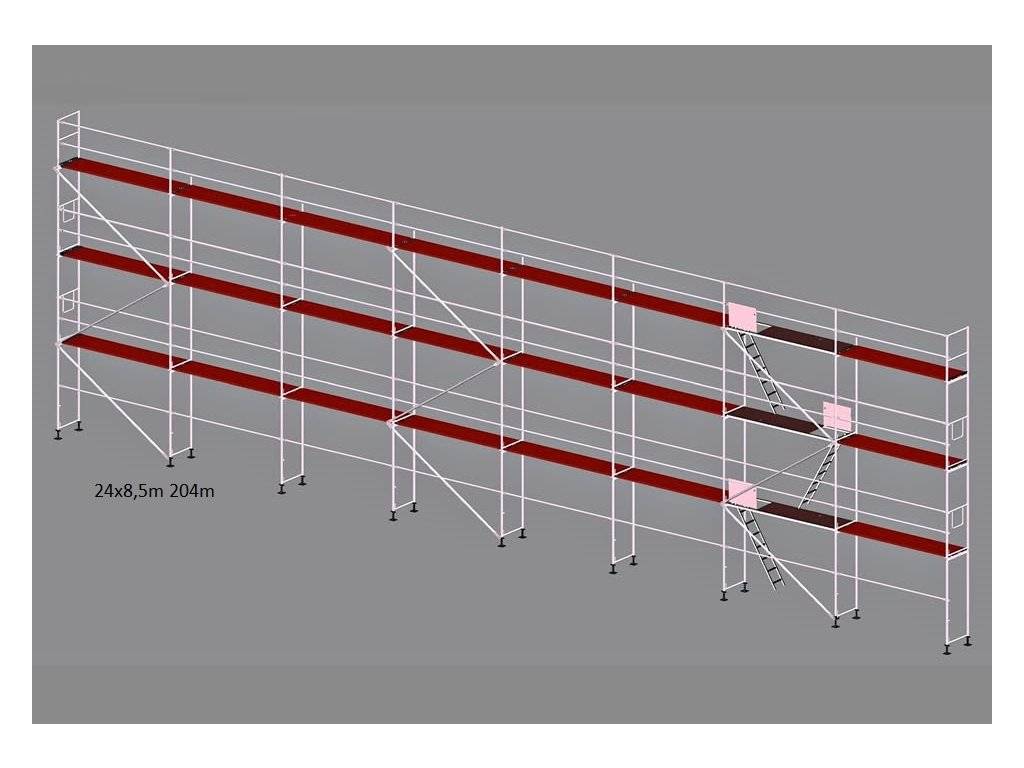 Kompletní sestava rámového lešení značky Mj UNI 70 / Plettac o rozměrech 24 x 8.5m 204m2 pracovní plochy (8 polí) s hmotností 1876kg